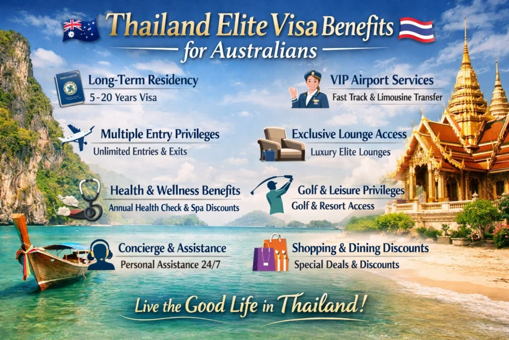 Your Complete Guide to Long-Term Living in Thailand For Australians dreaming of a long, stress-free stay in Thailand, the Thailand Elite Visa is one of the most attractive long-term visa solutions available. Designed for high-net-worth individuals, retirees, business owners, and frequent travelers, this premium visa program offers far more than extended stay rights—it delivers convenience, prestige, and lifestyle privileges that standard visas simply cannot match. This guide explains the Thailand Elite visa benefits for Australians, eligibility requirements, membership options, and why this visa is increasingly popular among Australian citizens looking to live, work remotely, or retire in Thailand. What Is the Thailand Elite Visa? The Thailand Elite Visa is a long-term multiple-entry visa issued under a government-backed membership program. Depending on the package selected, Australians can stay in Thailand legally for 5, 10, 15, or even 20 years without the need for frequent renewals